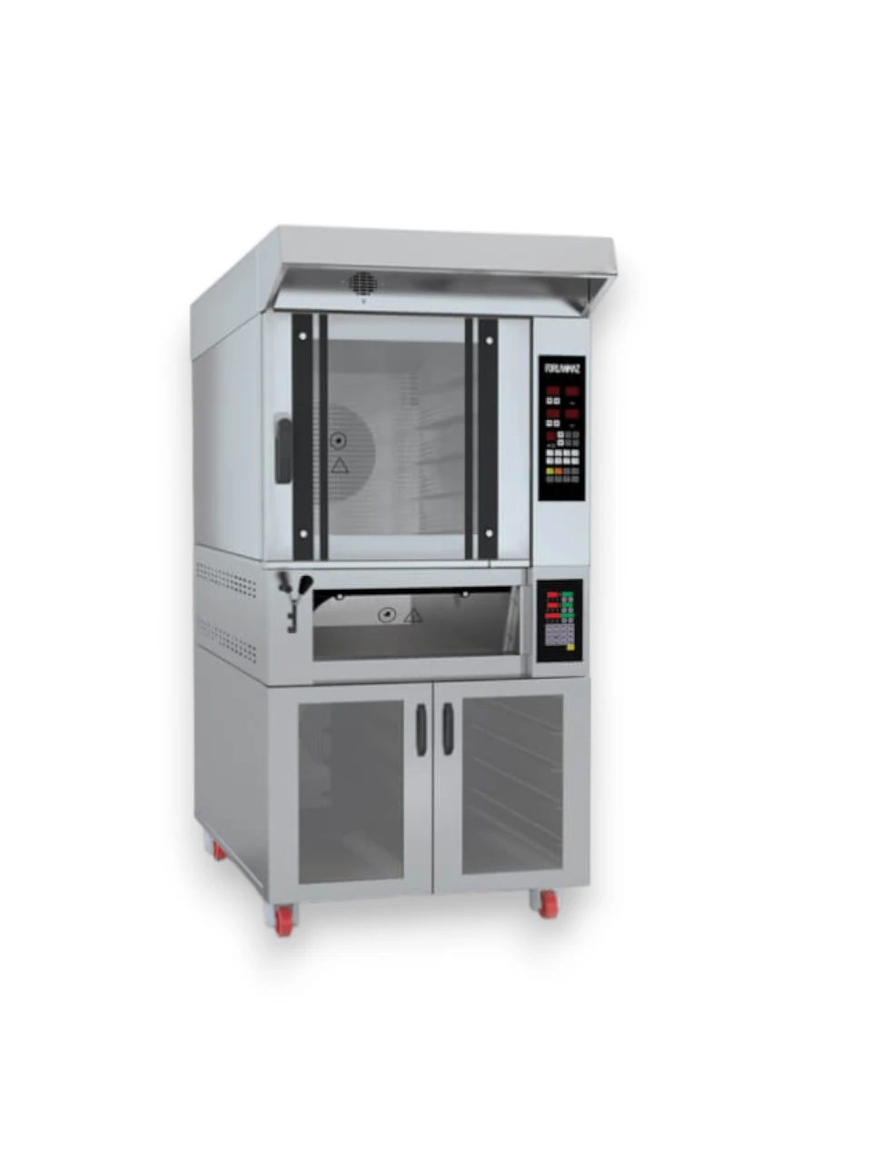 Rotary Rack convection oven and deck oven combination is particularly suitable for baking of baking pastry products, gastronomy products and big or small bread. It is useful for confectioners, restaurants and hotels. At the bottom of the oven there is a fermentation cabinet for the yeast having dough. This oven has a very good uniformity of baking and vaporizer placed inside the baking chamber. High quality insulation ensures energy saving.