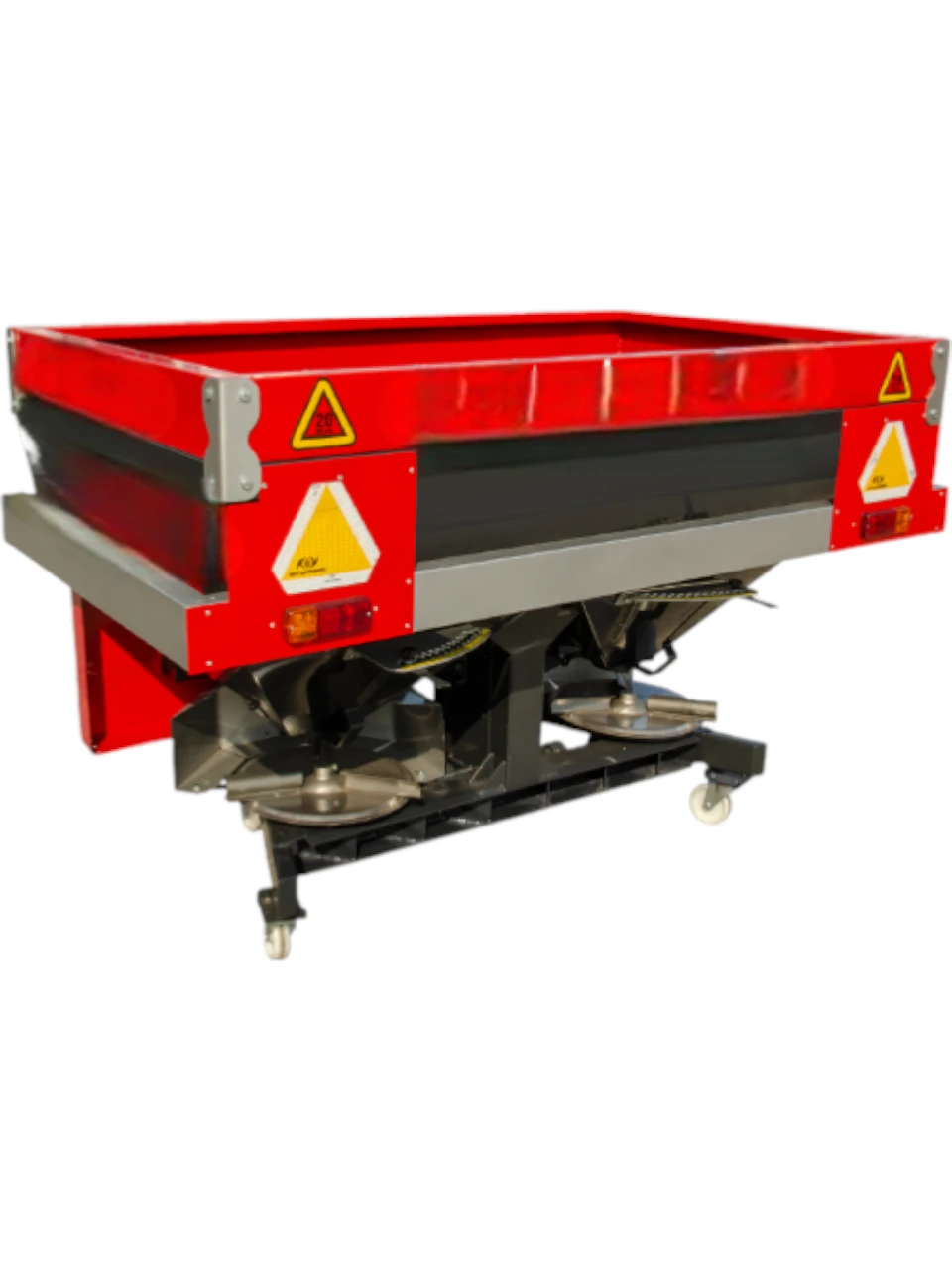 The double-disc fertiliser spreaders, manufactured as the suspended (hydraulic) type, are attached to the tractor via a three-point hitch system. The spreaders can be manufactured with hydraulic control. Thanks to the hydraulic control lever, fertiliser application at field boundaries is very easy from the tractor cab, and the machine can be closed quickly to prevent unnecessary fertiliser waste. The low-speed horizontal mixer inside the fertiliser hopper ensures homogeneous flow without breaking up or damaging the fertiliser. This ensures that the fertiliser is distributed more homogeneously across the field and flows more smoothly. The machine’s fertiliser spreading width can reach 18-36m. The hopper capacity comes in three types: 1000, 1200 and 1500 litres.